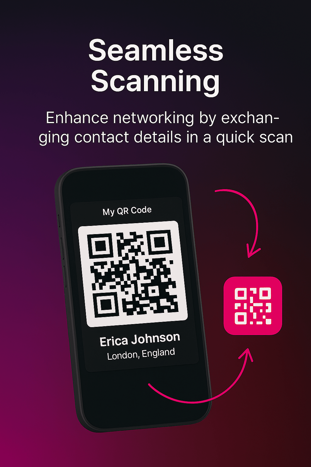 Networking without the hassle. Share your QR code or scan someone else’s to connect instantly – every contact is saved automatically.